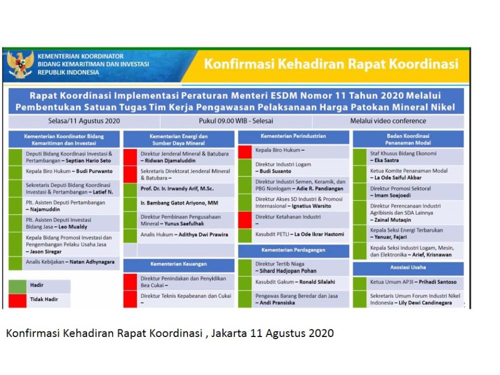 Rapat Koordinasi Implementasi Peraturan Menteri ESDM Nomor 11 Tahun 2020 Melalui Pembentukan Satuan Tugas Tim Kerja Pengawasan Pelaksana Harga Patokan Mineral Nikel. Jakarta, 11 Agustus 2020 2